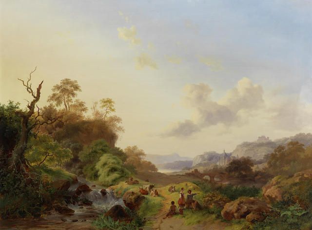 Summer landscape with figures and cattle near a waterfall
