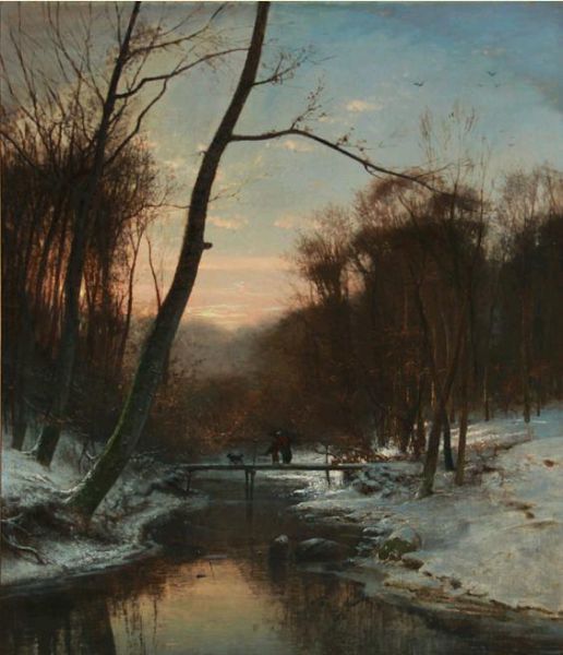 | Winter day in the woods with a woman and a child carrying firewood | |