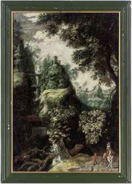 | Figures in a mountainous, wooded landscape with a waterfall | |