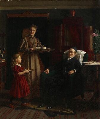 | Interior with a mother and daughter serving tea for an elderly gentleman. | |