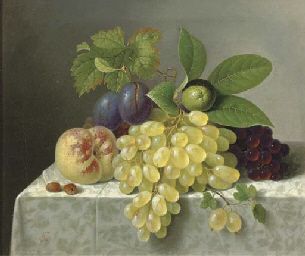 Still life with grapes, a peach and a lime