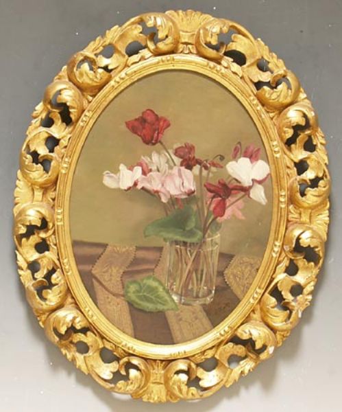 Sillleben mit Alpenveilchen im Glas auf Tisch arrangiert.