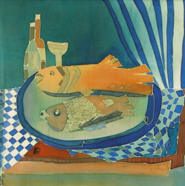 Küchenstillleben mit zwei Fischen und Weinflaschen