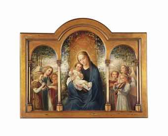 | A triptych: The Virgin and Child (central panel); Three Angels playing the harp and the flute (left wing); and Three Angels play | |