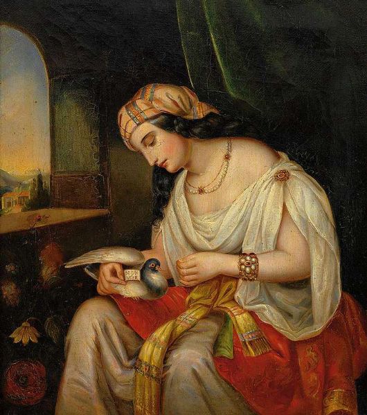 | Junge Frau im orientalischen Habit mit Brieftaube; seitlich Durchblick in Landschaft | |