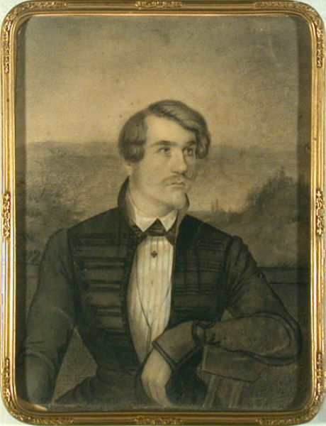 | Brustbild eines jungen Mannes in geschnürter Jacke mit umgelegtem Kragen und Halsbinde vor weiter Landschaft. | |