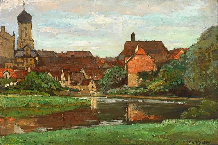 Städtchen mit spiegelndem Gewässer an einem Sommertag