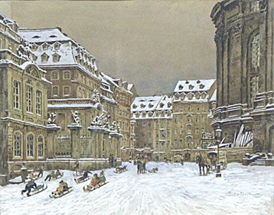 Winterliche Ansicht von Dresden mit Kindern beim Schlitten fahren