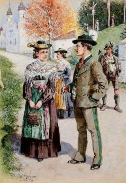 Bauern in Festtagstracht vor der Tölzer Kalvarienbergkirche