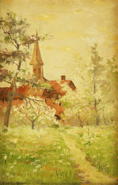 Frühlingslandschaft mit Kirche im Hintergrund.