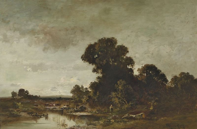 Magd mit Kühen am Weiher