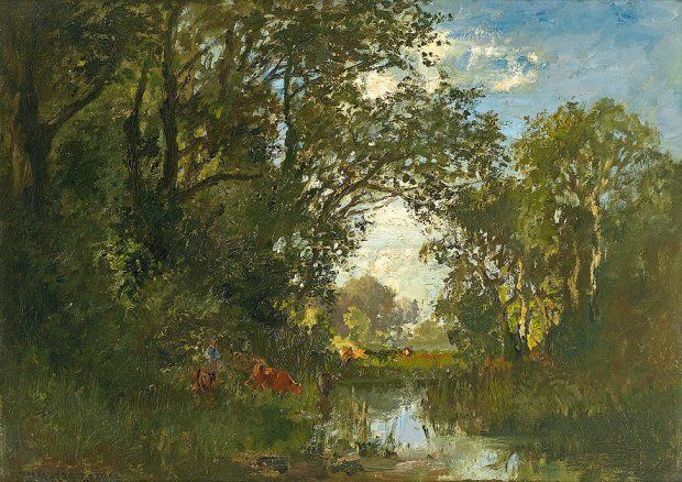 Waldlandschaft mit Teich und Kühen auf einer Lichtung