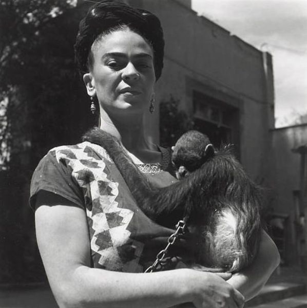 | Frida Kahlo with her pet monkey in front of her studio in Coyoacan, Mexico | |
