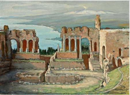 Blick auf das antike Theater von Taormina, im Hintergrund der rauchende Aetna