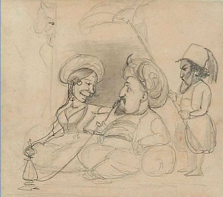 | Caricature with Countess Danner, King Frederik VII of Denmark Chamberlain Carl Berling, in the doorway the devil is discerned. | |