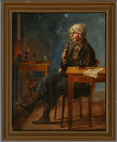 Interior with a man smoking a pipe.
