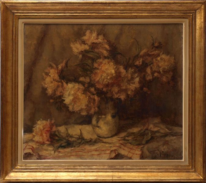 | Tisch mit altertümlichem Geschirrtuch, darauf voll erblühter Pfingstrosenzweig neben einem Pfingstrosenstrauß in einem Tonkrug. | |