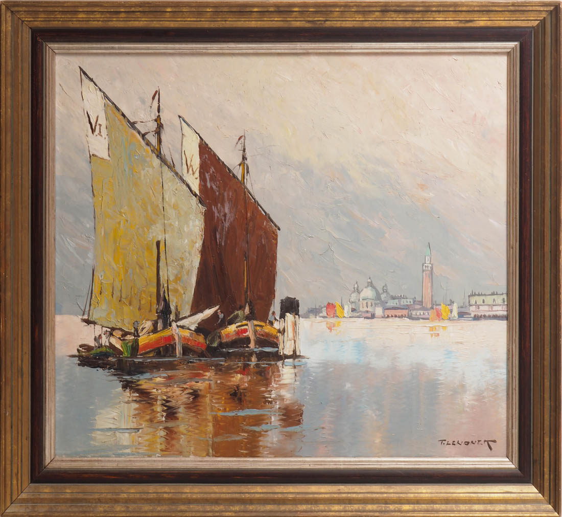 Fischerboote in der Lagune, im Hintergrund die Häuser und Türme von Venedig