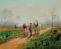 Bauernfamilie mit Kaltblüter auf dem Feld