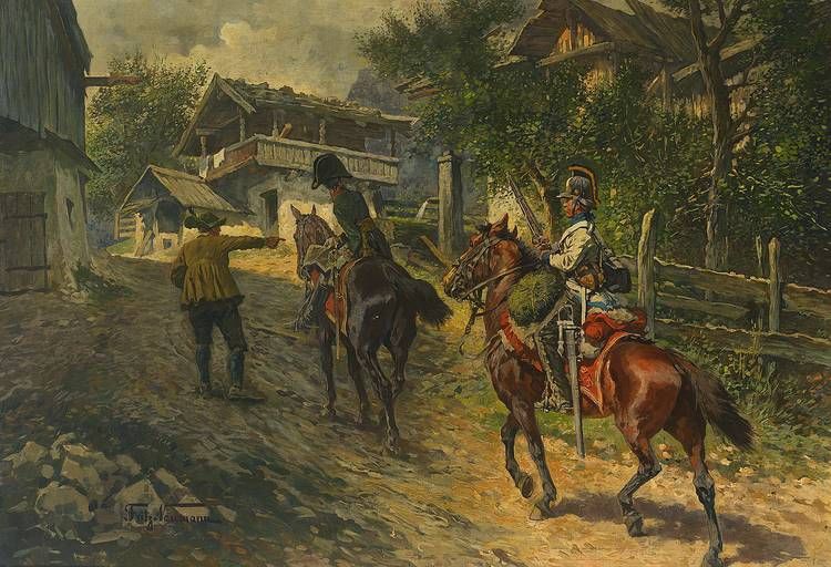 | Tiroler Dorf an einem Sommertag. Bauer zeigt berittenem Offizier und Kavallerist den Weg | |
