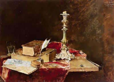 Sill Life with Books, Papers and a Candlestick on a Table Top