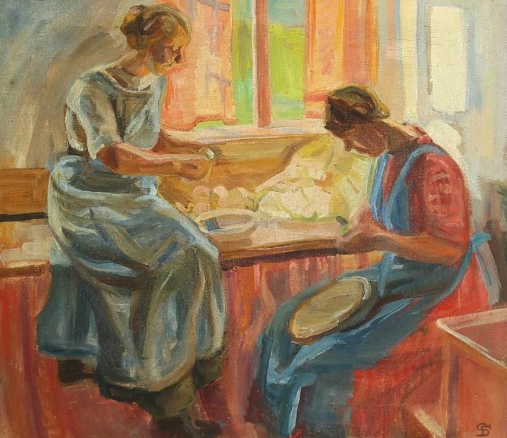 Sunlight in the kitchen. Two young women preparing vegetables.