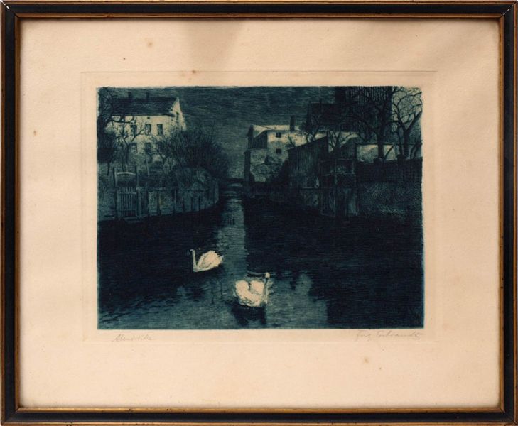 Zwei Schwäne auf einem nächtlichen Kanal in einem kleinen Dorf