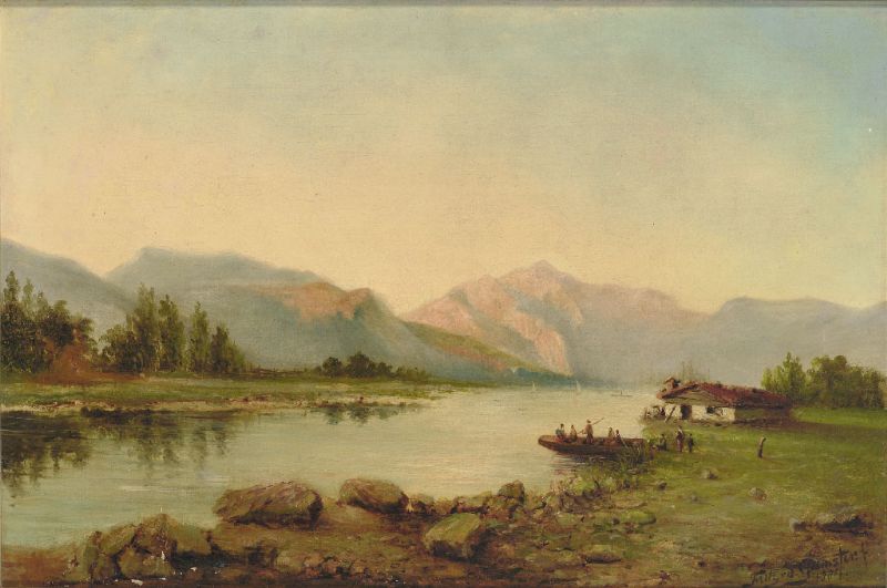 Gebirgssee mit übersetzendem Kahn, Gehöft und Bergen im Abendlicht