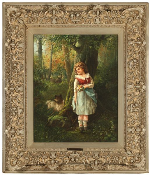 Little Girl Holding Flowers with a Dog in a Forest Interior