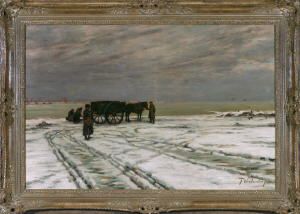 Personen mit Pferdefuhrwerk in winterlicher Küstenlandschaft