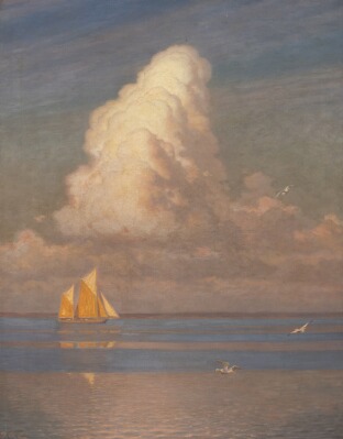 | Coastal scenery with a sailing ship and seagulls in the sunlight | |