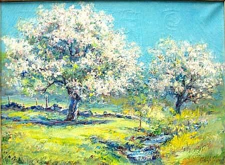 Spring landscape with apple trees in blossom and small stream