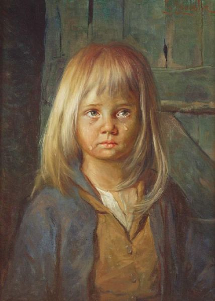 | Porträt eines kleinen, blonden Mädchens, mit Schmollmund, Stupsnase, ein paar kullernde Tränen laufen über das hübsche Gesicht | |