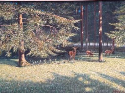 Hirsche auf sonnendurchfluteter Waldlichtung