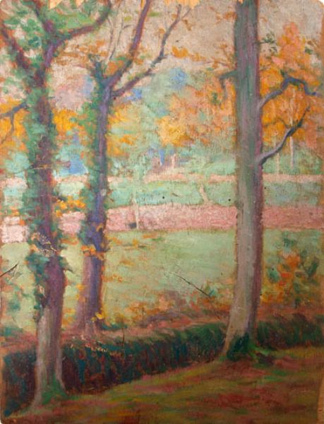 Bauernkate in weiter Frühlingslandschaft mit blühenden Bäumen. Verso weite Herbstlandschaft.