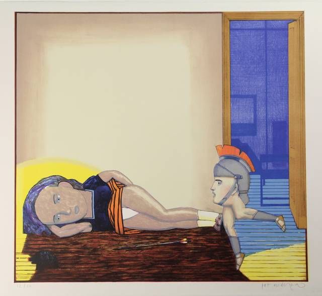 | A Roman soldier's head on legs running towards a reclining girl | |