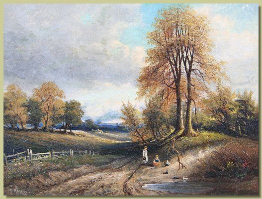 | Children feeding ducks by a pond in a wooded landscape and children fallen trees with turbulent river beyond | |