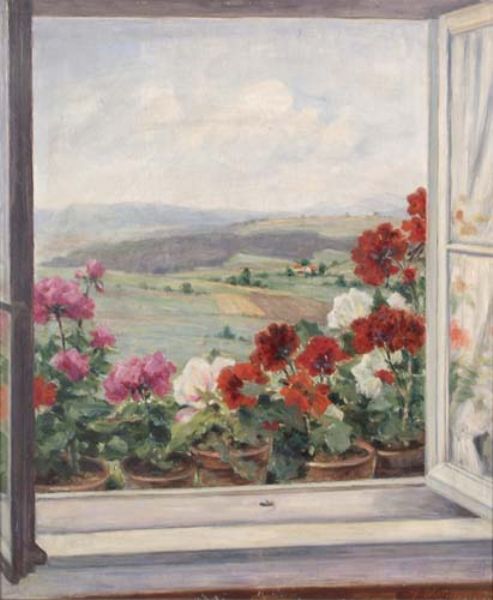 Fenster mit blühendem Blumenstöcken und