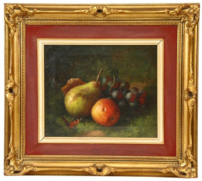 Stilleben med äpple, päron, druvor och nässelfjäril.
