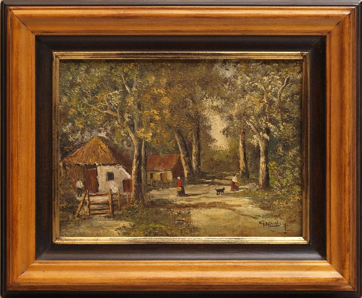 Bauernkaten in lichtem Laubwald, dazwischen Figurenstaffage