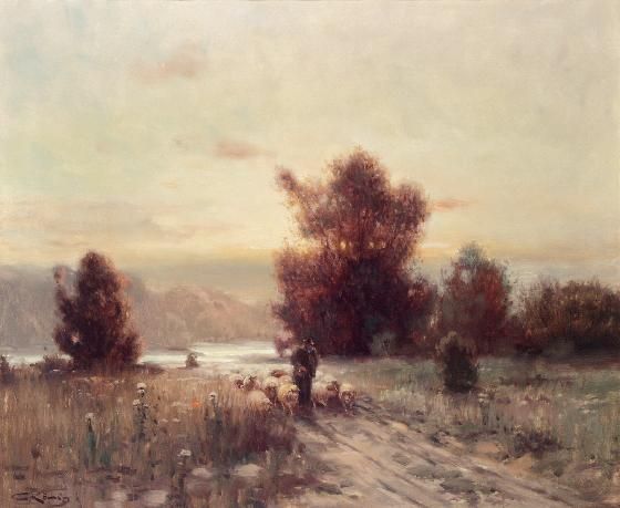 Schäfer mit seiner Herde in spätherbstlicher Landschaft