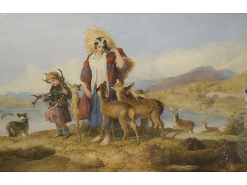A MOTHER AND DAUGHTER SURROUNDED BY DEER