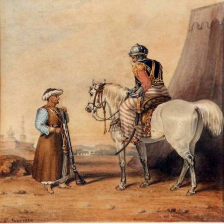 A Middle-Eastern Soldier on White Arab Horse and further Figure Standing Holding a Rifle