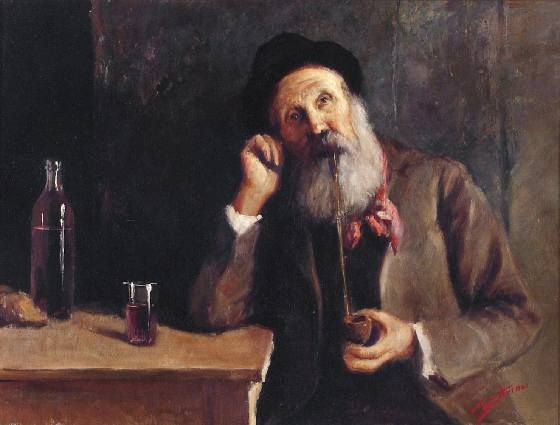 Gaststube, bärtiger Alter seine Pfeife rauchend