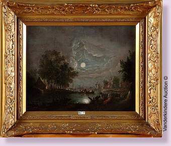 Paysage lacustre animé au clair de lune