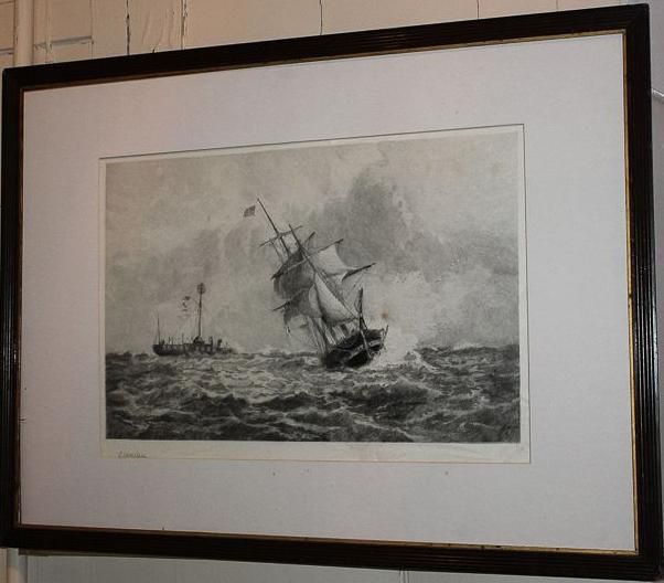 the Sanov Hook steam ship, and a sailing ship in rough seas