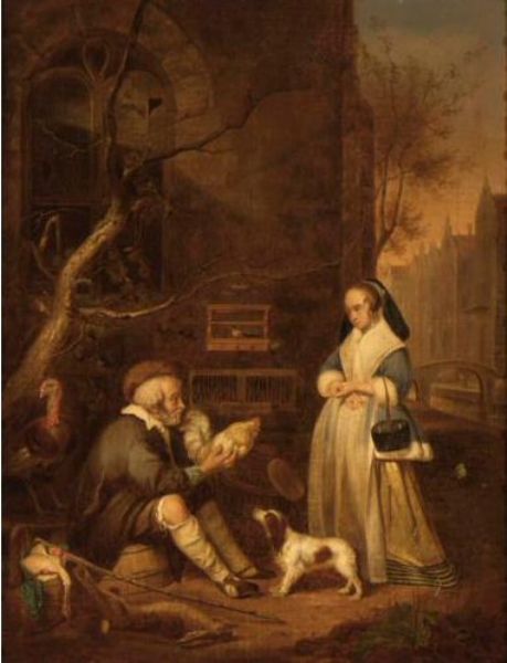 A POULTERER SELLING A CHICKEN TO AN ELEGANT LADY