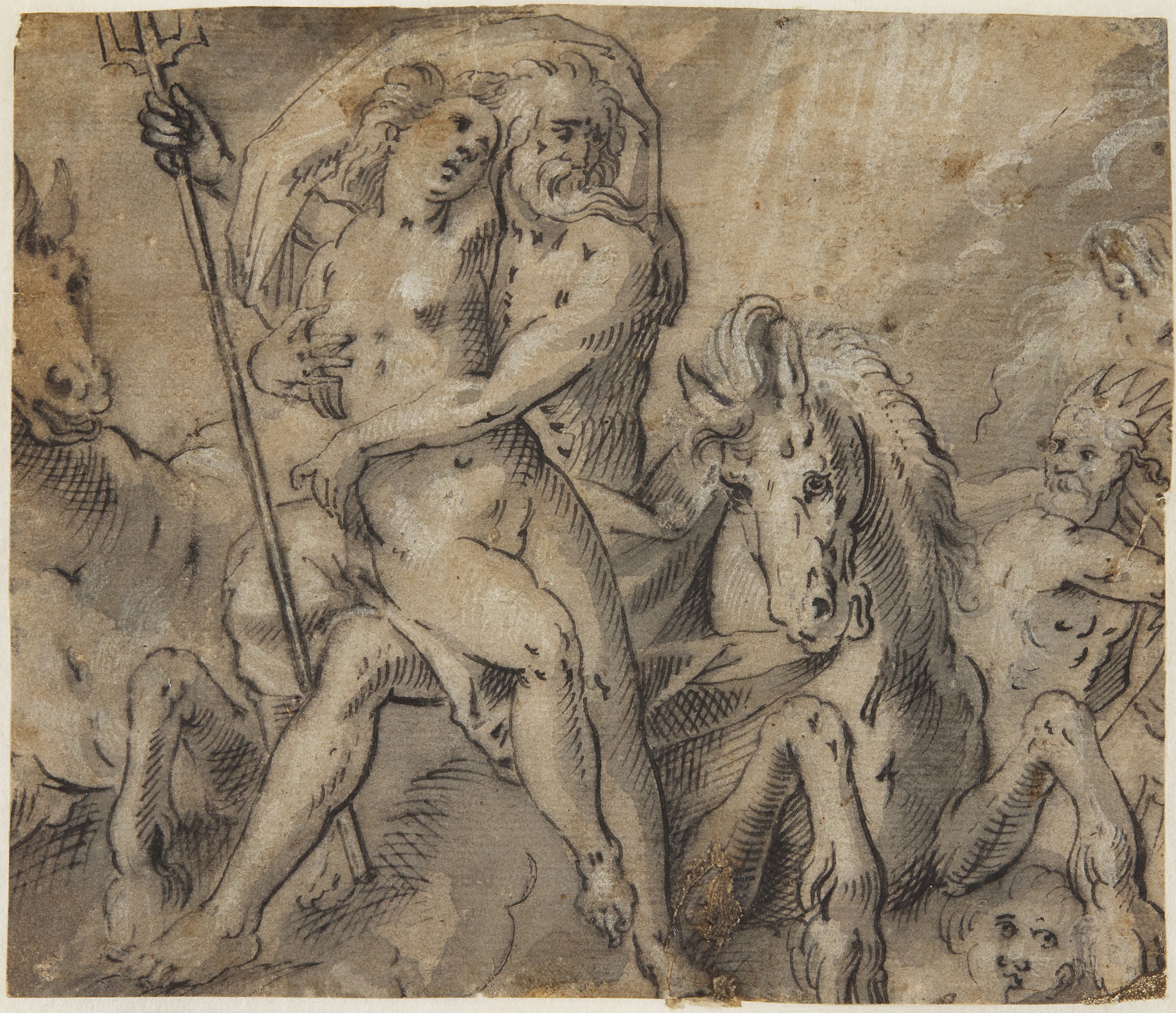 | Pen and black ink and grey wash, heightened with white, over traces of black chalk | |