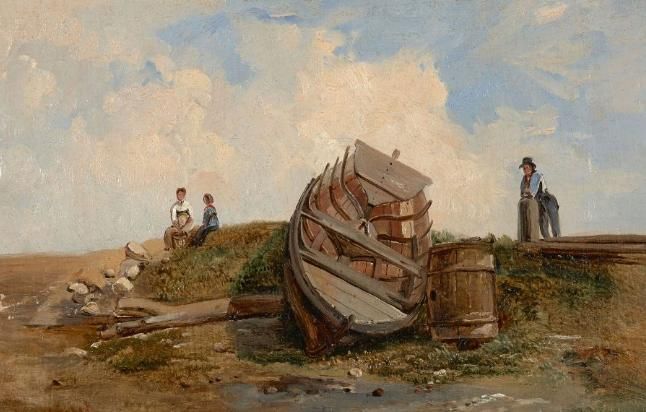 Barque et personnages sur la grève