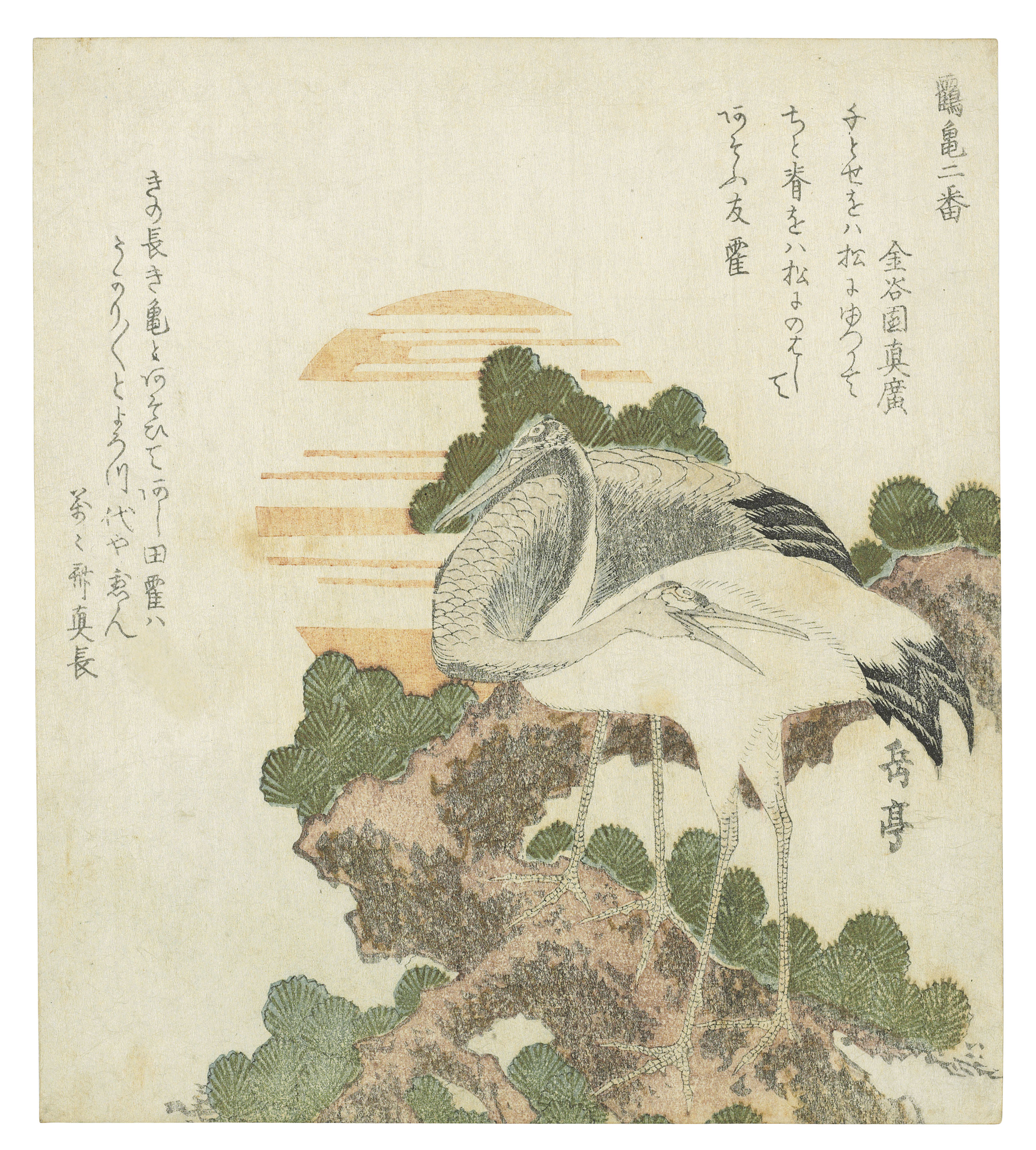 TWO CRANES ON A PINE BRANCH BEFORE THE SUN